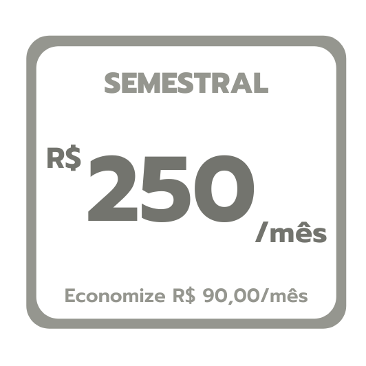 Assine o nosso plano semestral, no valor de 6 vezes de R$ 250,00 e economize R$ 90,00/mês.